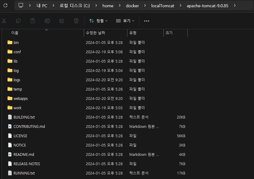 2. Docker에 Volume 잡을 폴더를 로컬에 생성하고 Tomcat 설치 후 원하는 어플리케이션을 webapps 폴더에 넣는다.